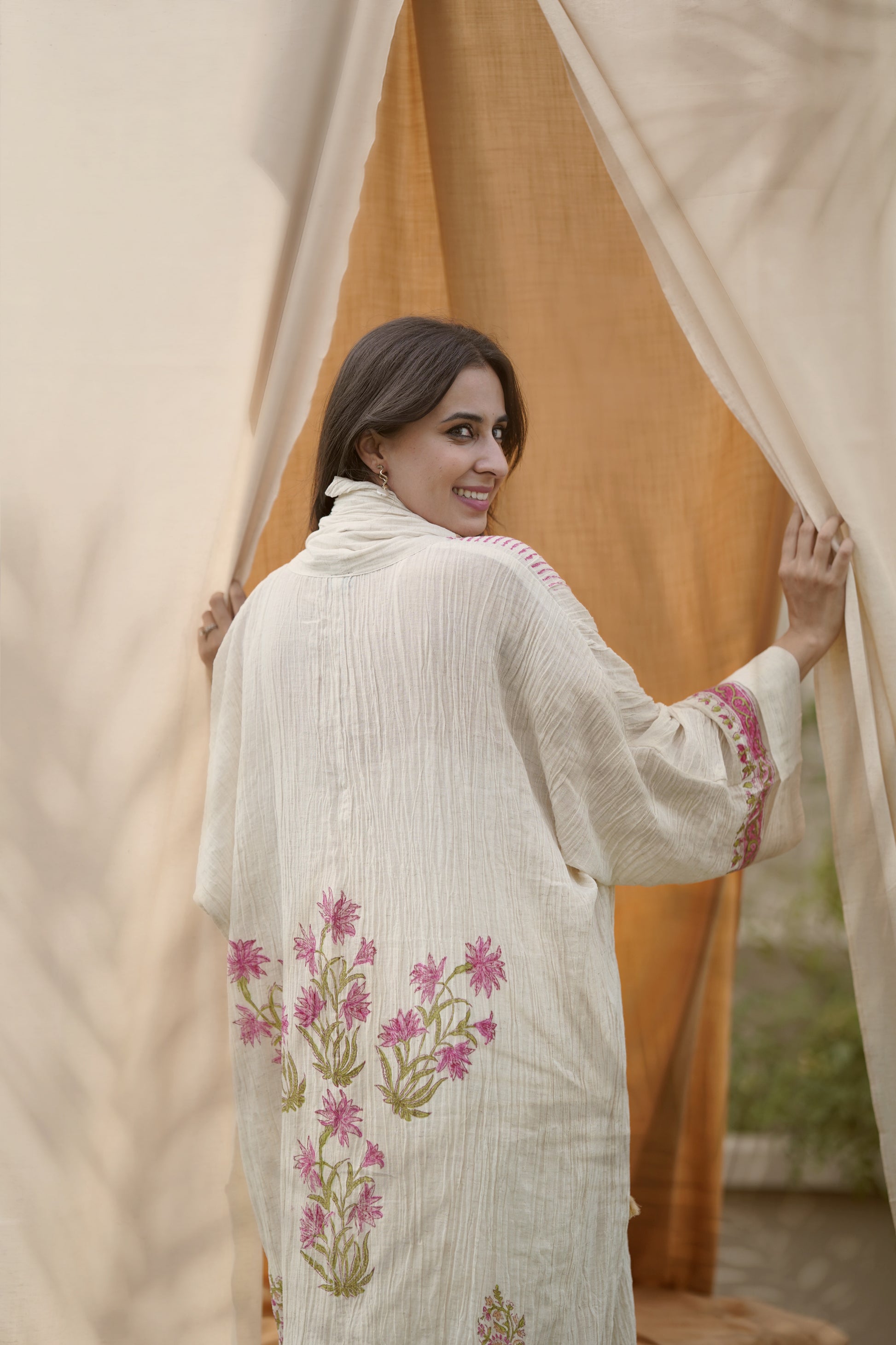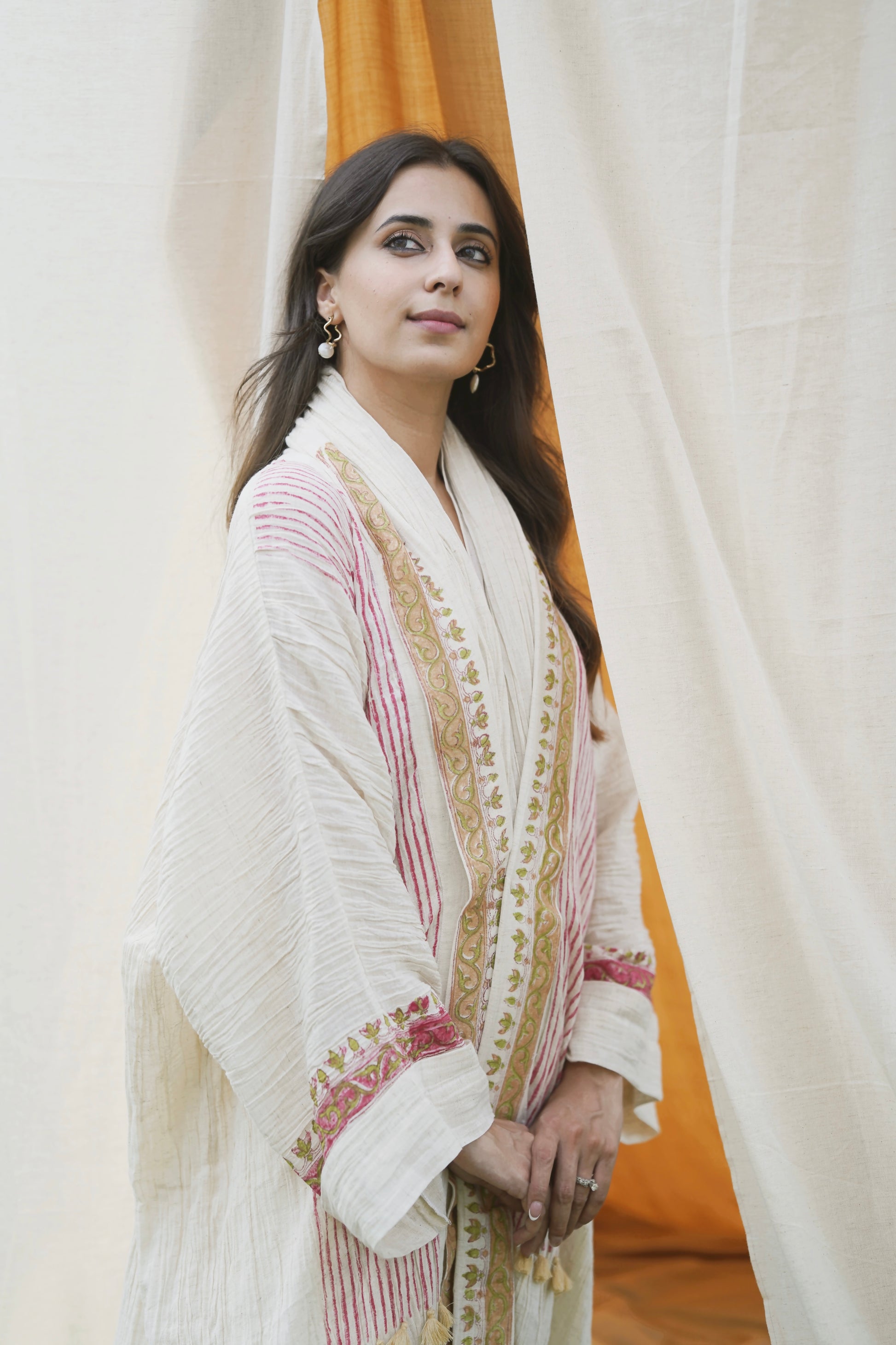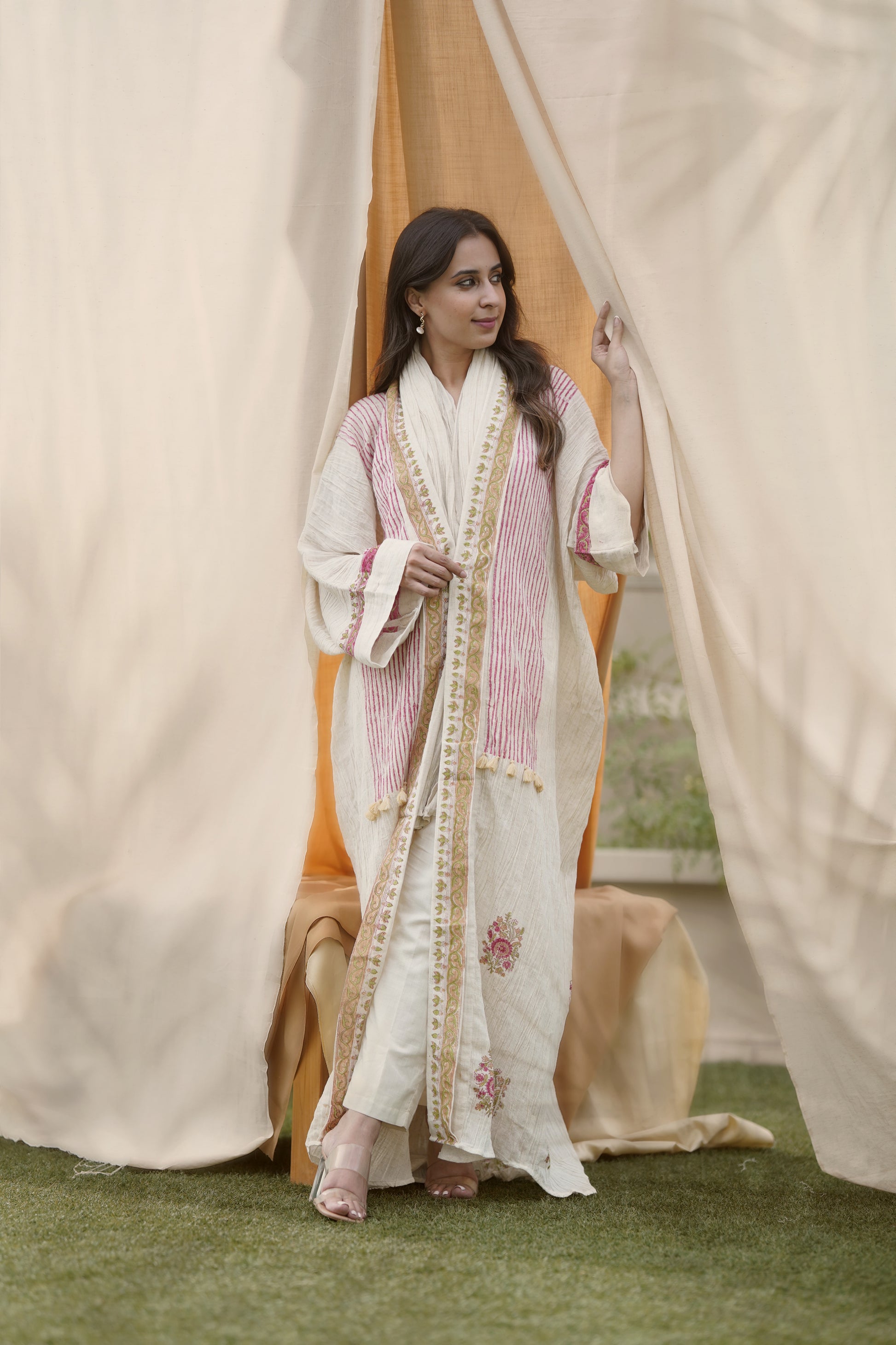 These are pure linen Abaya with an inner dress and scarf. The abaya, inner dress and scarf, all are hand painted by exclusive hand painting artisans in India. It is available in Bisht cut as well as regular cut. The fabric used is handmade and can be dry cleaned and steam ironed for its longevity. It is a classic summer abaya and allows easy breezy air to pass through it ans making you feel comfortable and cool. They are very appropriate for office, vacation and formal wear.