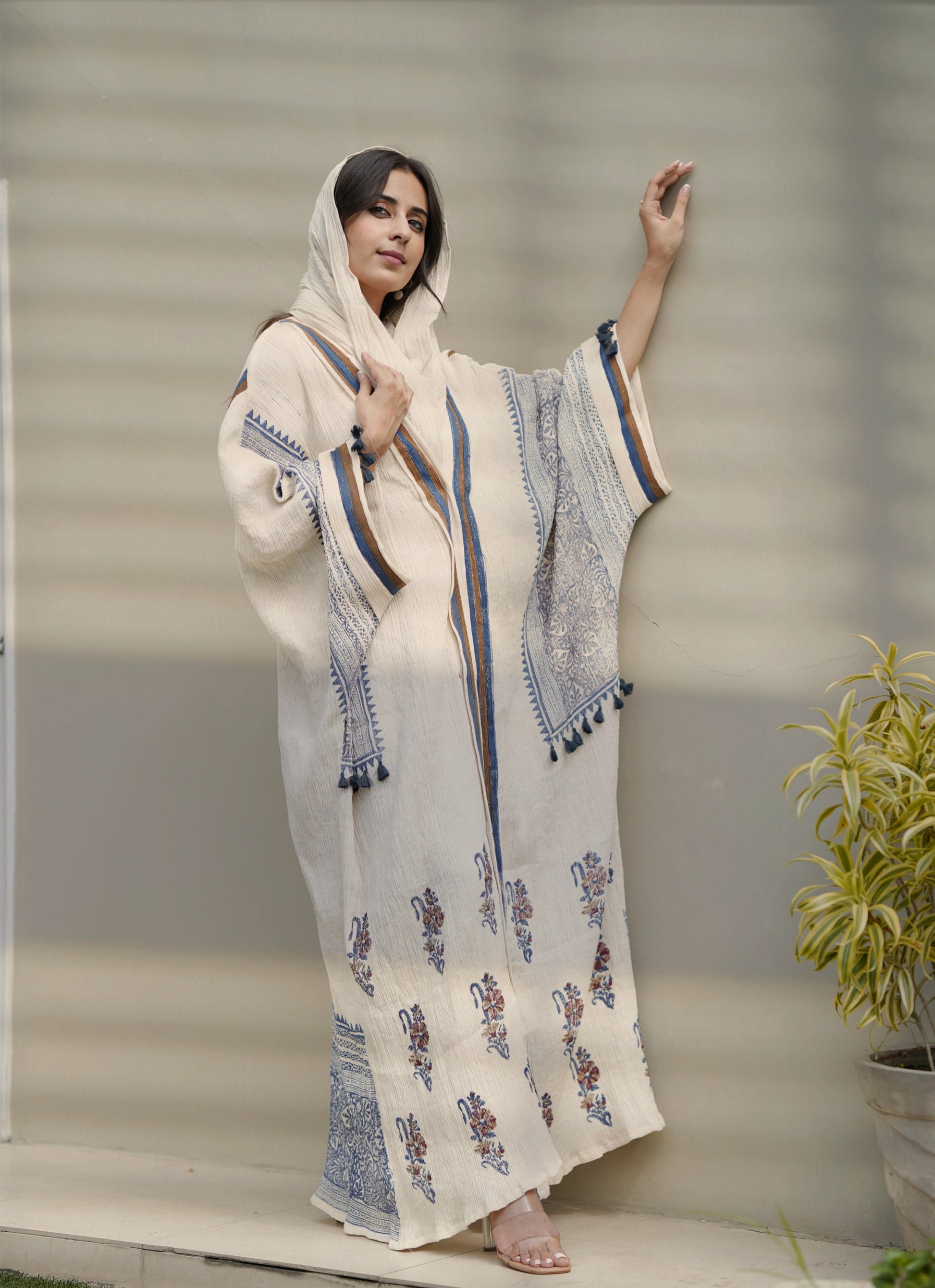 These are pure linen Abaya with an inner dress and scarf. The abaya, inner dress and scarf, all are hand painted by exclusive hand painting artisans in India. It is available in Bisht cut as well as regular cut. The fabric used is handmade and can be dry cleaned and steam ironed for its longevity. It is a classic summer abaya and allows easy breezy air to pass through it ans making you feel comfortable and cool. They are very appropriate for office, vacation and formal wear.