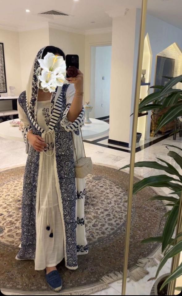 Rooted in tradition and culture, this abaya is curated in handmade organic cotton linen, it is textured with hand painted strokes in emerald green. It comes with a handprinted scarf, an a line inner dress, and an abaya outer with drawstring attached to the front, giving it a trending, go-getter look! Coupled with minimal accessories and simple heels, it will epitomise regal luxury!